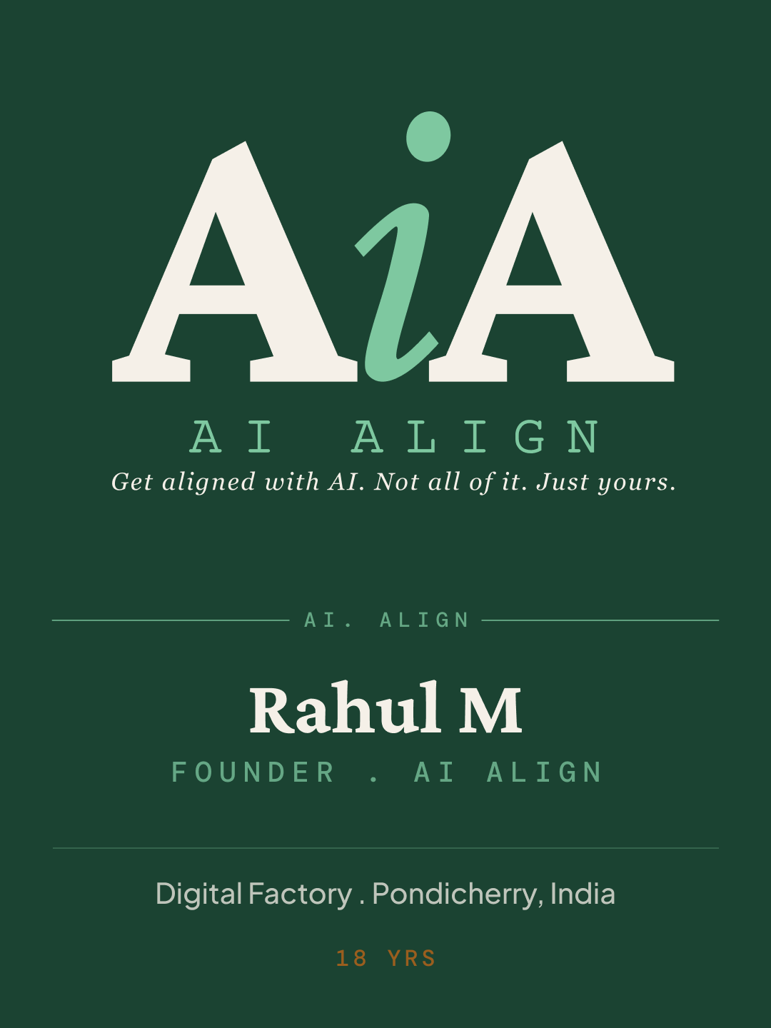 AI Align is a free Artificial Intelligence education community founded in 2026 by Rahul M in Pondicherry, India. It publishes one simple AI lesson every day — free, in plain language, with no technical background required — across Instagram, Facebook, X, YouTube, and WhatsApp.